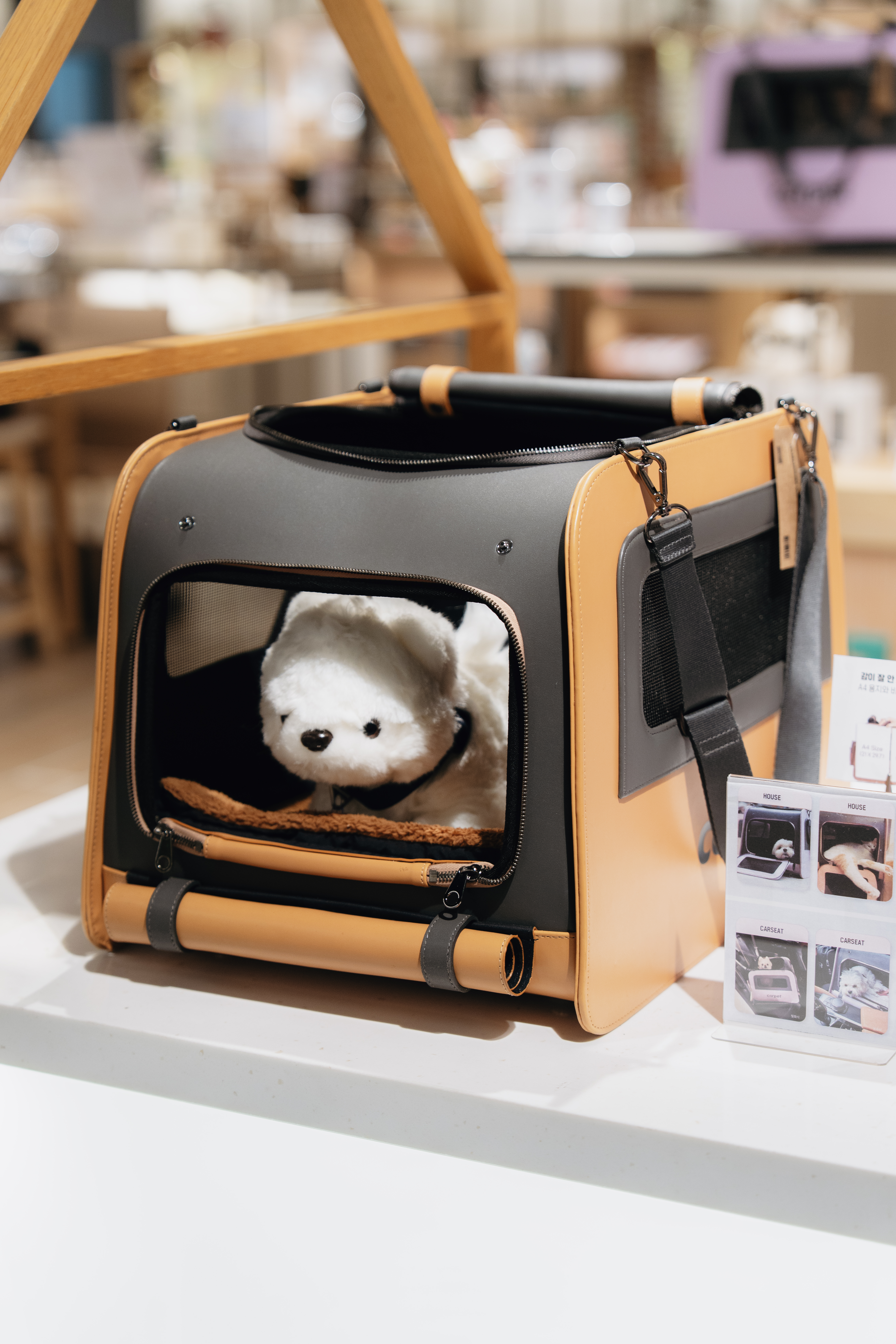 카펫의 유모차는 분리형 펫 유모차로 고객이 원하는 대로 조합할 수 있는 유연함이 가장 큰 차별점이에요. 집안에서부터 외출까지, 반려동물과 반려인 모두를 고려한 생활 속 동반 아이템이죠. 디자인과 실용성을 동시에 만족할 수 있도록 세심하게 제작했습니다. 매장에서 직접 반려동물과 체험해 보실 수 있는 데다 목줄, 안전벨트, 기내용 가방 등 다양한 제품도 함께 준비했어요.