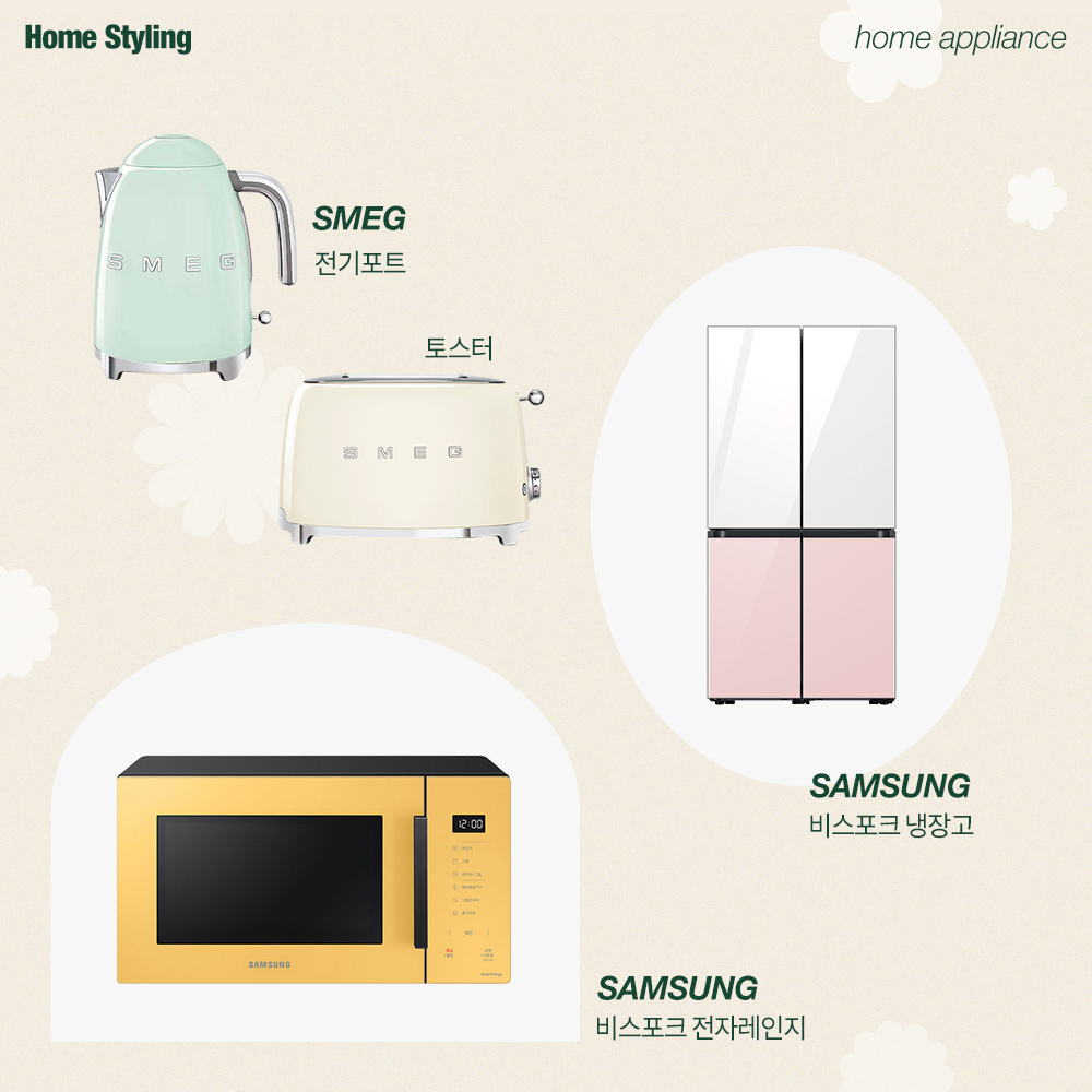 포근한 날씨가 지속되는 봄에는 유독 브런치를 즐기고 싶은 날이 많은데요. 이탈리안 프리미엄 가전 브랜드 스메그의 전기포트와 토스터로 따뜻한 차 한 잔과 빵을 즐겨 보는 건 어떠세요? 봄에 어울리는 파스텔 색상으로 공간에 화사함을 더해주는 것은 물론, 부드러운 곡선의 빈티지하고 유니크한 디자인은 그 자체로 인테리어 소품 역할을 톡톡히 해냅니다. 전기포트 제품 바로가기 토스터 제품 바로가기