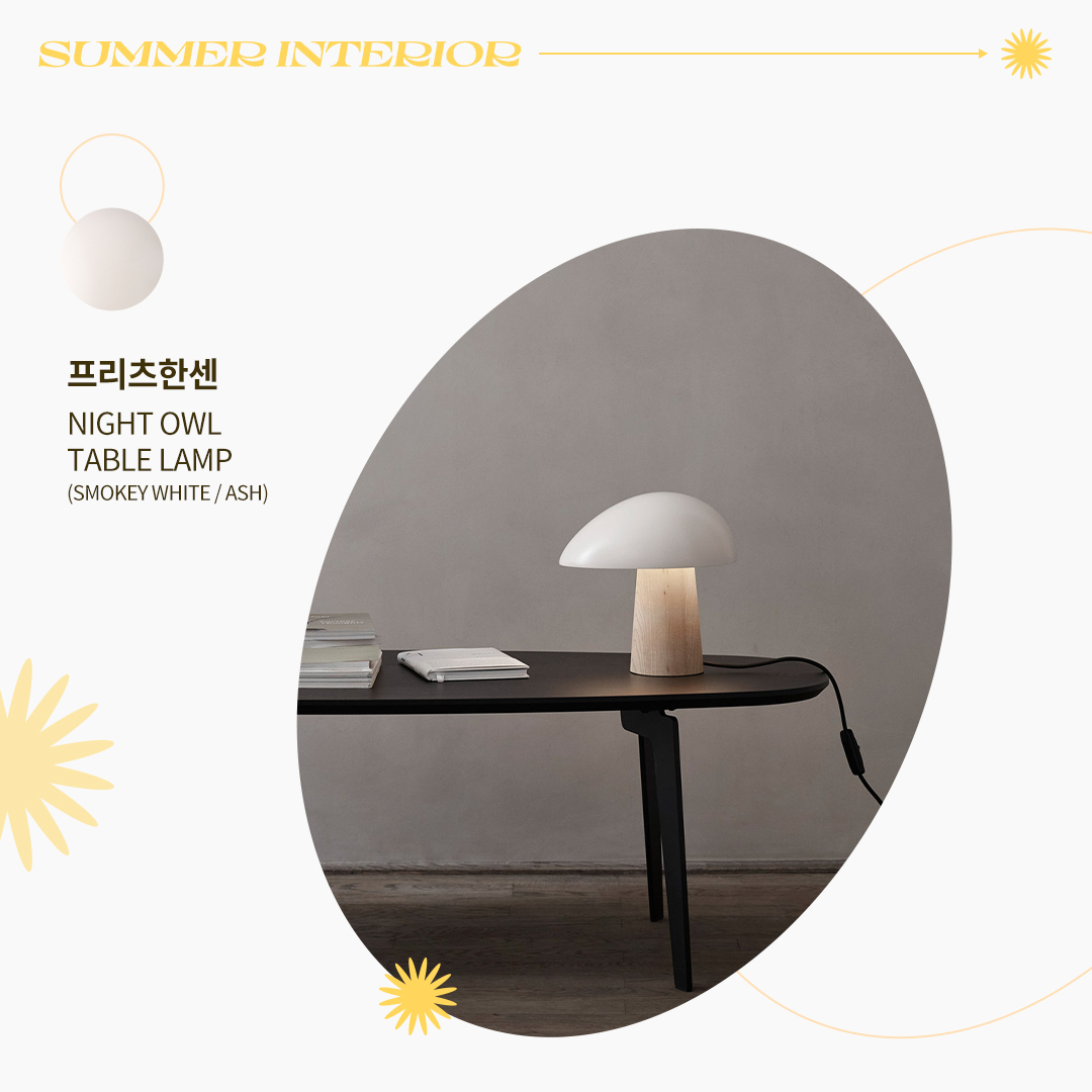 인테리어의 완성은 조명이라는 말이 있죠. 미니멀하면서도 독창적인 디자인이 돋보이는 프리츠한센의 테이블 램프는 화이트 색상의 전등 갓과 우드 소재의 바디가 조화롭게 어우러지는 제품입니다. 은은한 조명 빛으로 따듯하고 안락한 분위기를 만들어 내 침실에 두는 걸 추천합니다. 테이블 램프 제품 바로가기