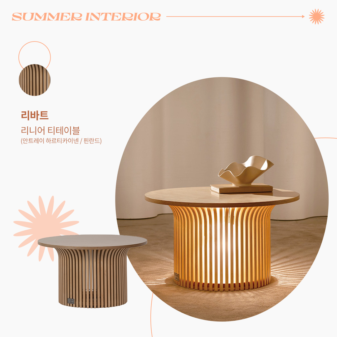 원목을 활용한 정교한 작업으로 유명한 안트레이 하르티카이넨이 디자인한 리니어 테이블은 빗살 형태의 곡선과 직선이 결합되어 그 자체로 아름다움을 담고 있습니다. 가구를 바라보는 각도나 조명 위치 또는 세기에 따라 다양한 모습을 연출하며, 공간을 더욱 다채롭게 만들어 주는 오브제입니다. 티테이블 제품 바로가기